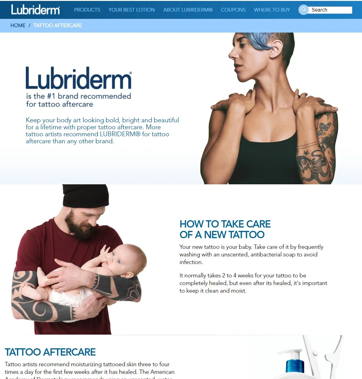 Lubriderm is a widely known moisturizer brand that often had been recommended by tattoo artists as a way to treat new tattoos after they had healed. As tattoos have become more popular, the brand sought to raise awareness of this application by creating a new, search-optimized destination to be targeted by marketing and endorsements from the artists.